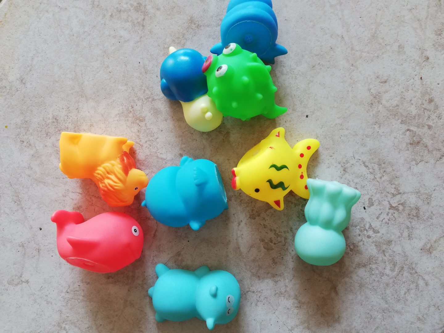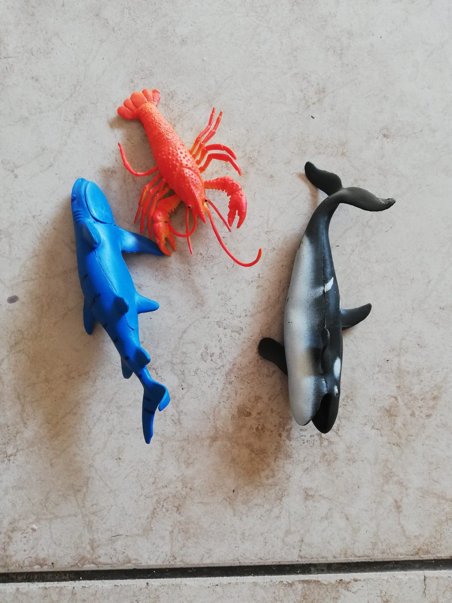 I bought some plastic sea animals of different sizes for this sea themed one. Some of them had little squeakers in which adds a different sensory experience and Emma enjoyed these ones more than Jack.